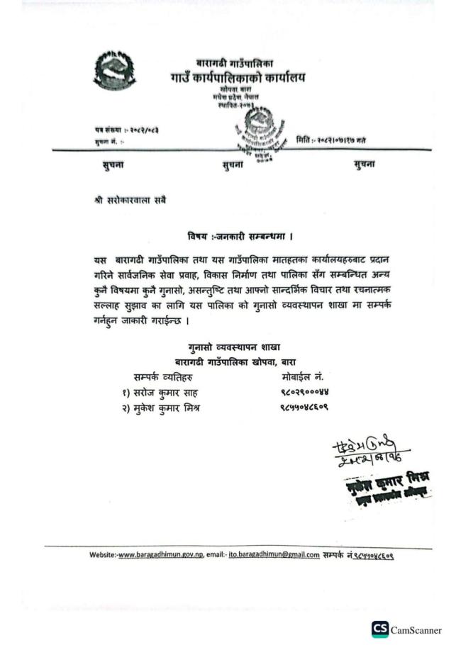 गाउँपालिकासँग सम्बन्धित कुनै पनि गुनासो, सुझाव वा रायका लागि गुनासो व्यवस्थापन शाखामा सम्पर्क गर्न सकिनेछ। सेवा प्रवाहमा पारदर्शिता र जवाफदेहिताका लागि यो व्यवस्था गरिएको छ।