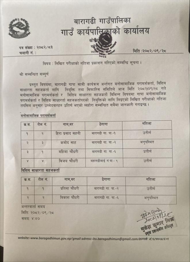 लिखित परिक्षाको नतिजा प्रकाशन गरिएको सम्बन्धी सूचना