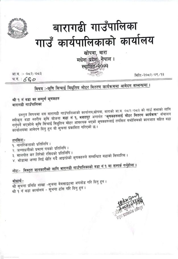 कृषि सिचाई विधुतिय मोटर वितरण कार्यक्रममा आवेदन सम्बन्धमा ।