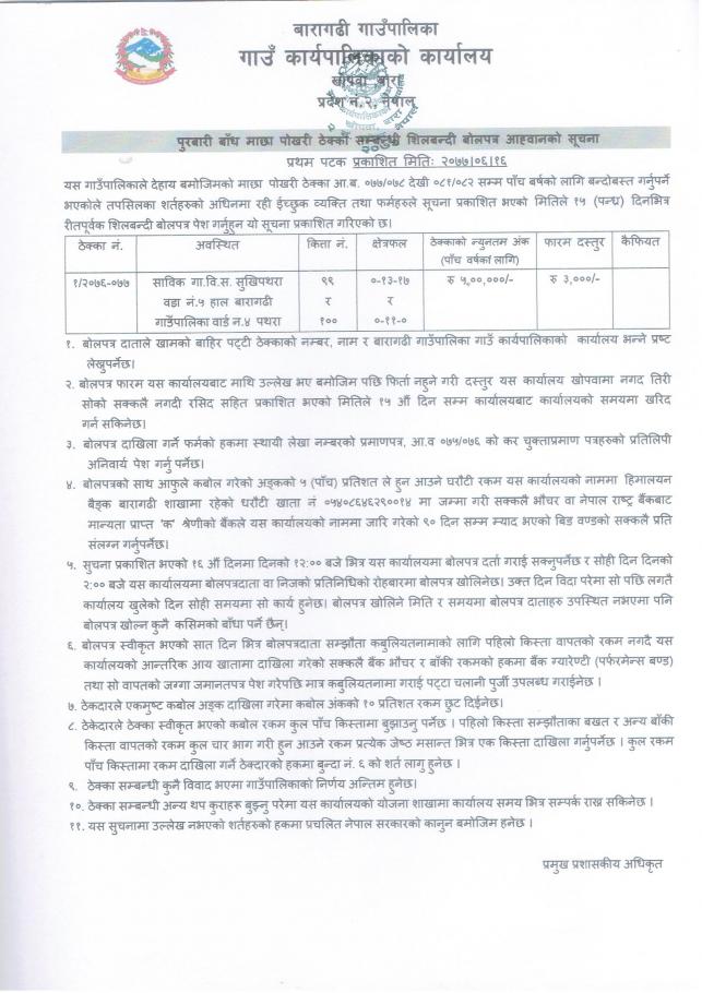 पूर्वारी बाँध माछा पोखरी को ठेक्का सम्बन्धी शिलबन्दी बोलपत्र अहवानको सूचना