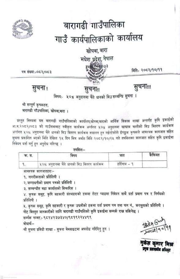 ५०% अनुदानमा चैते धानको विउ सम्बन्धि सूचना