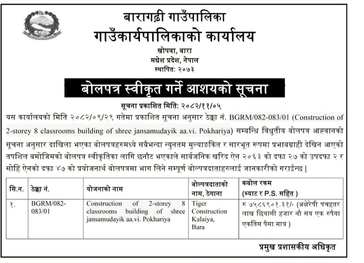 बारागढी गाउँपालिकाबाट बोलपत्र स्वीकृत गर्ने आशयको सूचना प्रकाशित गरिएको छ।सम्बन्धित सबै सरोकारवालाहरूलाई जानकारीका लागि साझा गरिएको छ।
