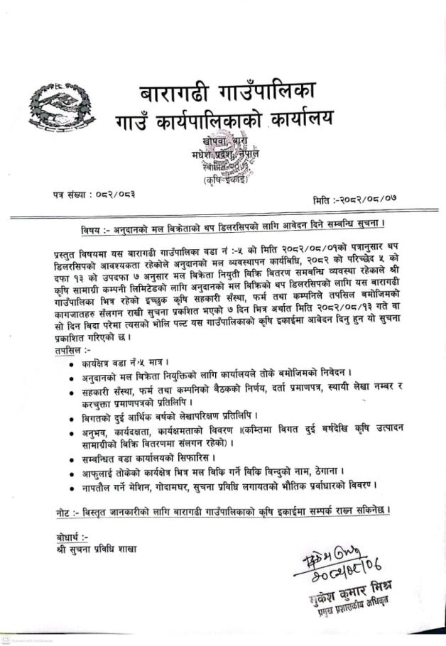 » अनुदानको मल बिक्रेताको थप डिलरसिपको लागि आवेदन दिने सम्बन्धि सुचना ।