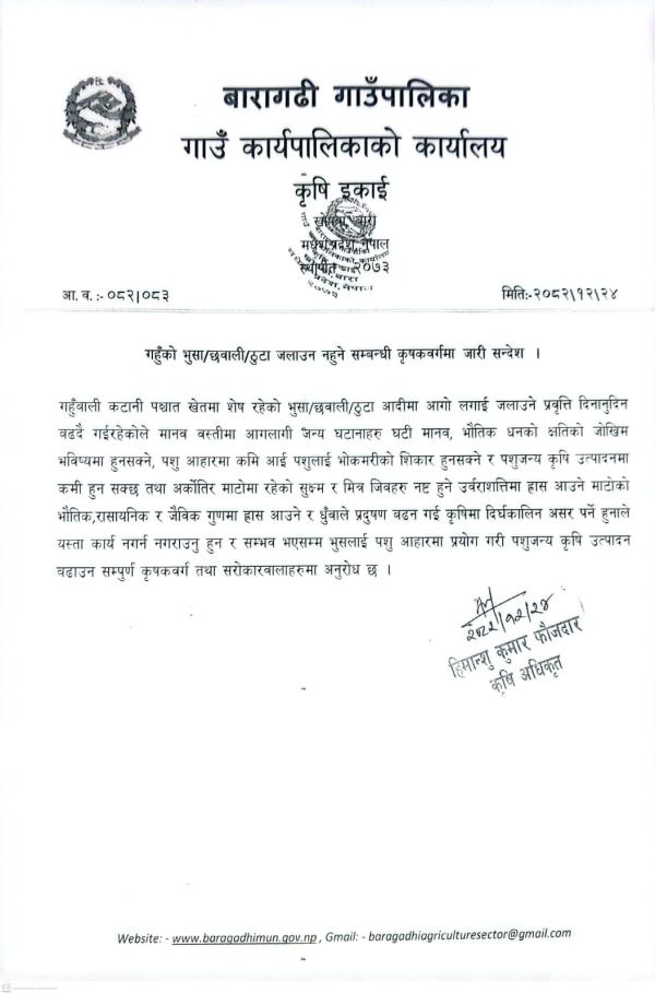 » गहुँको भुसा/छवाली/ठुटा जलाउन नहुने सम्बन्धी कृषकवर्गमा जारी सन्देश ।