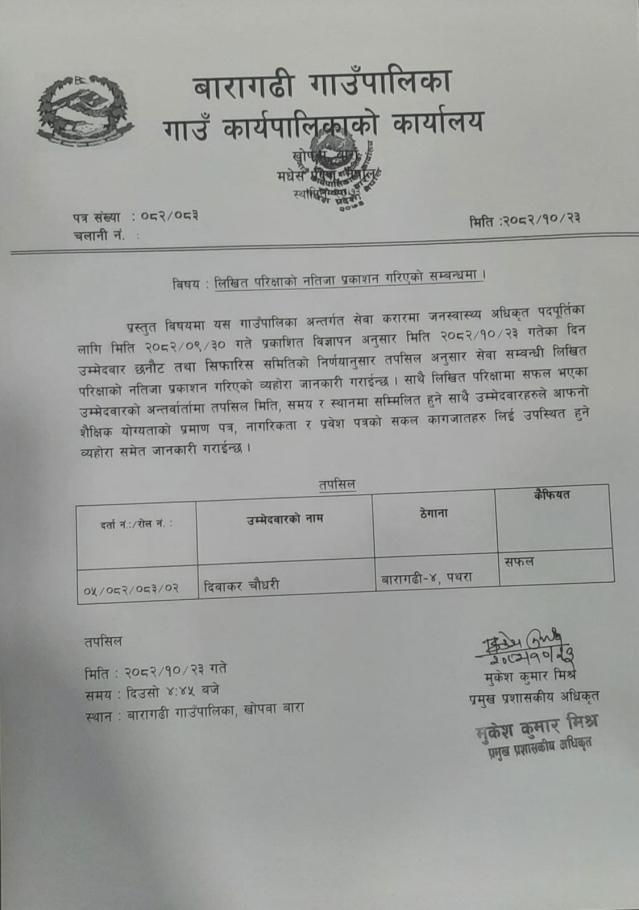 लिखित परिक्षाको नतिजा प्रकाशन गरिएको सम्बन्धमा ।