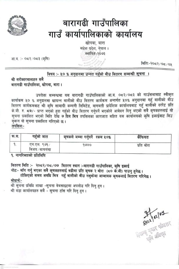 ५०% अनुदानमा उन्नत गहुँको बीउ वितरण सम्बन्धी सूचना ।