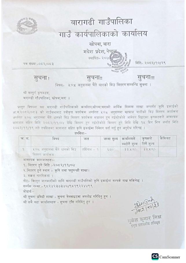 » ५०% अनुदानमा चैत धानको विउ वितरण सम्बन्धि सुचना ।