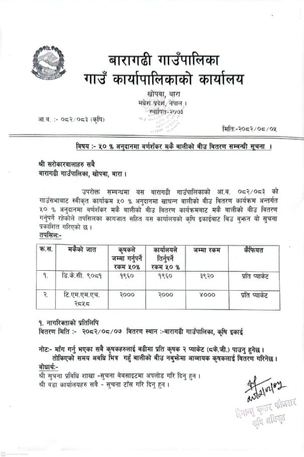 ५०% अनुदानमा वर्णशँकर मकै बालीको बीउ वितरण सम्बन्धी सूचना ।